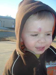 Rhett was helping pick up toys before lunch (no, this is not the first I am writing about!). He tripped on a block and split his head open on the coffee table. She said it bled quite a bit so I am glad I wasn't there for this "first." She rinsed his head under the shower and put a butterfly band-aid on it. Of course this is the day I work in Rose Hill, the farthest of my buildings from Potwin so it took me 45 minutes to get there. He was running around like a wild man.